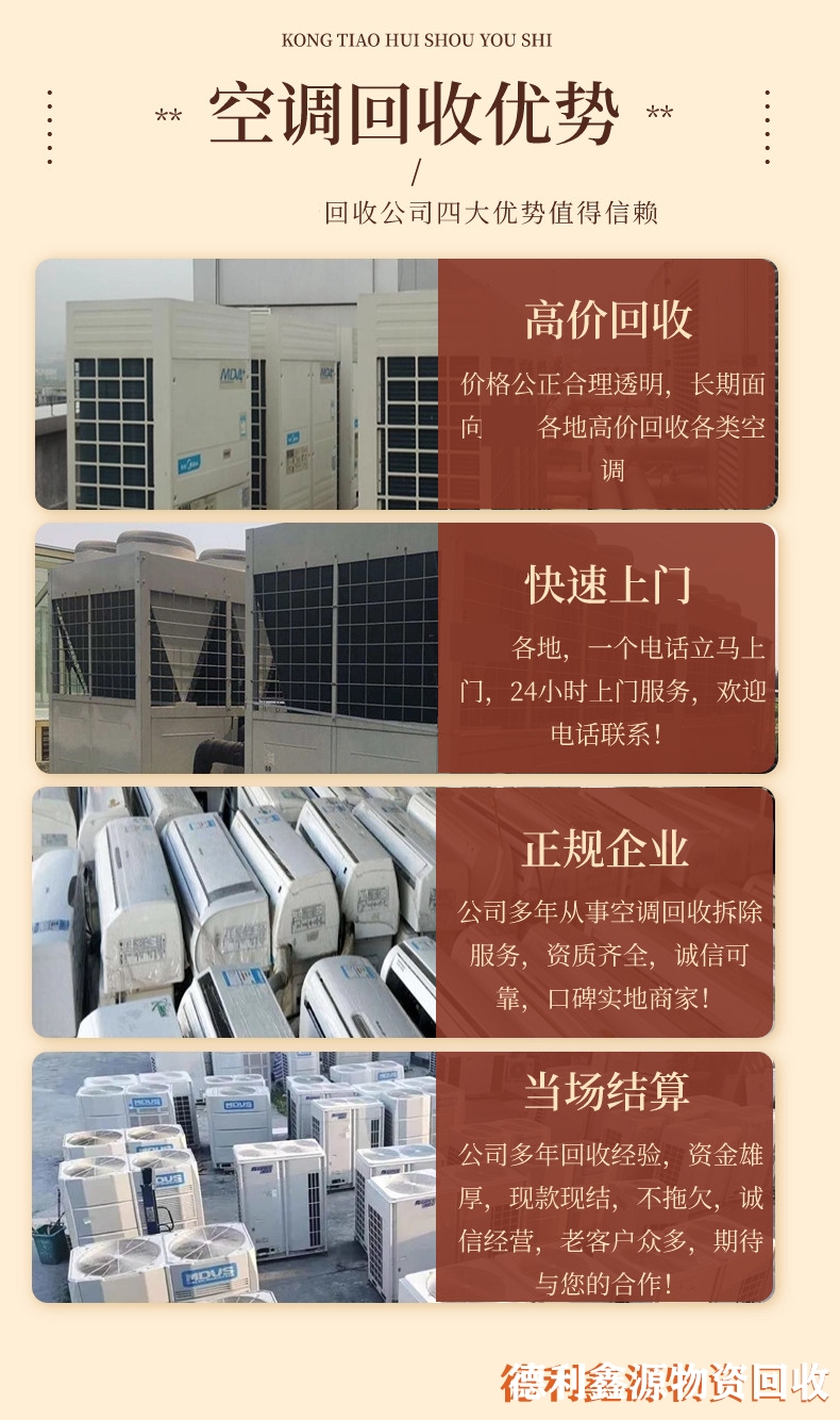 北京空調回收拆除,專業回收家用、商用、中央空調及制冷設備,價格合理,信守承諾,提供上門看貨、高價回收、現金交易服務,與多家企業長期合作。
